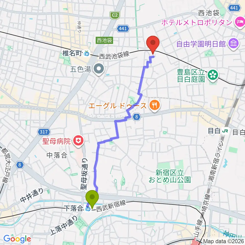 下落合駅からぴあピアノ教室へのルートマップ地図