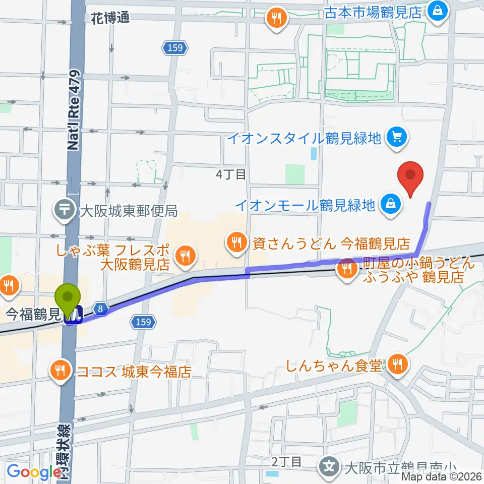 今福鶴見駅から山野楽器 イオンモール鶴見緑地店へのルートマップ地図