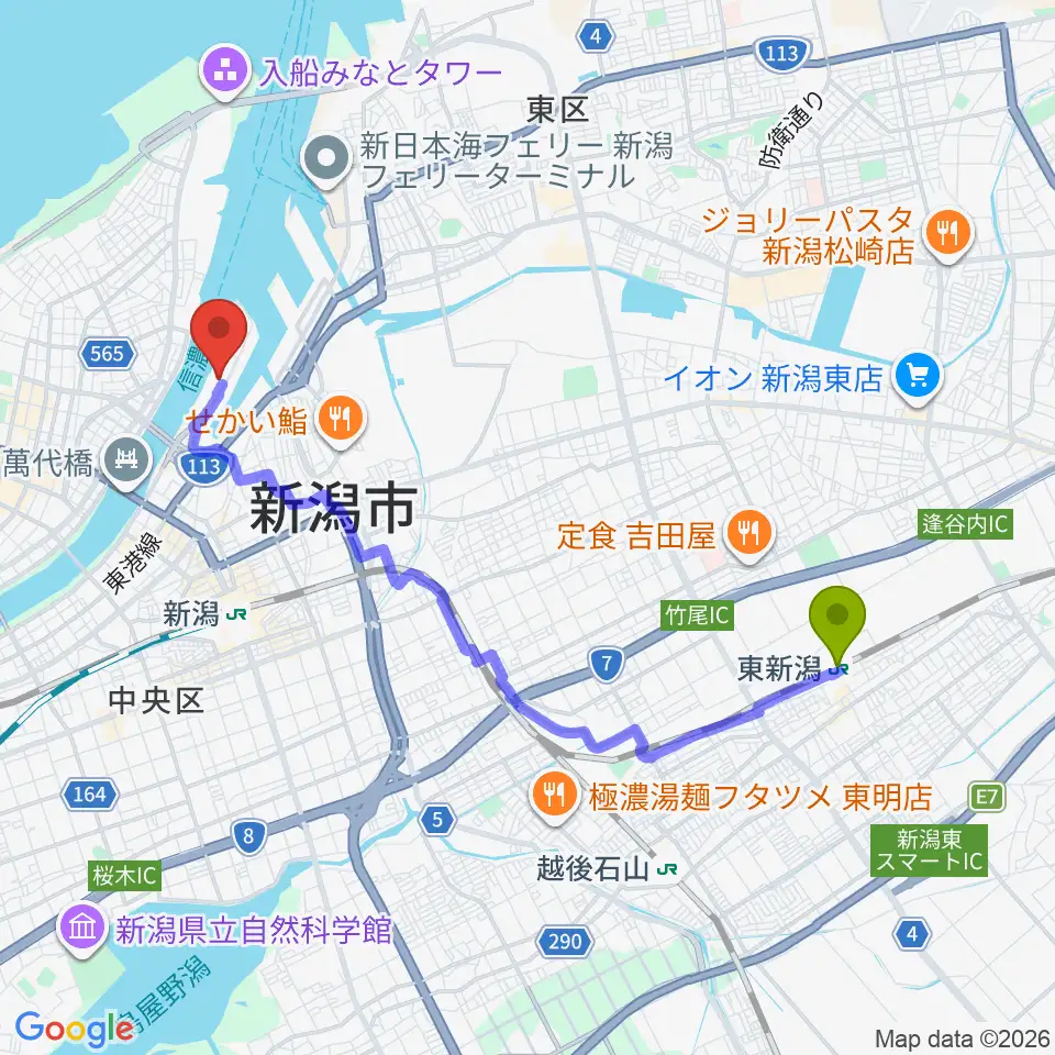 東新潟駅から朱鷺メッセへのルートマップ地図