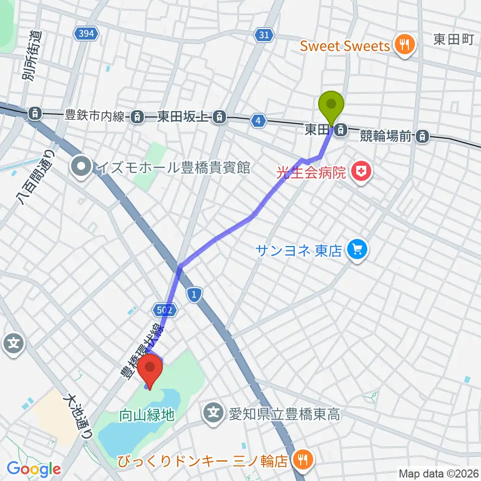東田駅から豊橋市民文化会館へのルートマップ地図