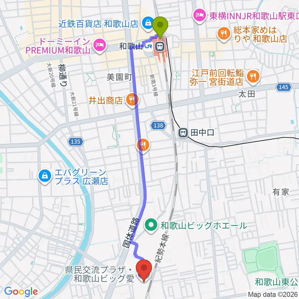 和歌山駅から県民交流プラザ 和歌山ビッグ愛へのルートマップ地図