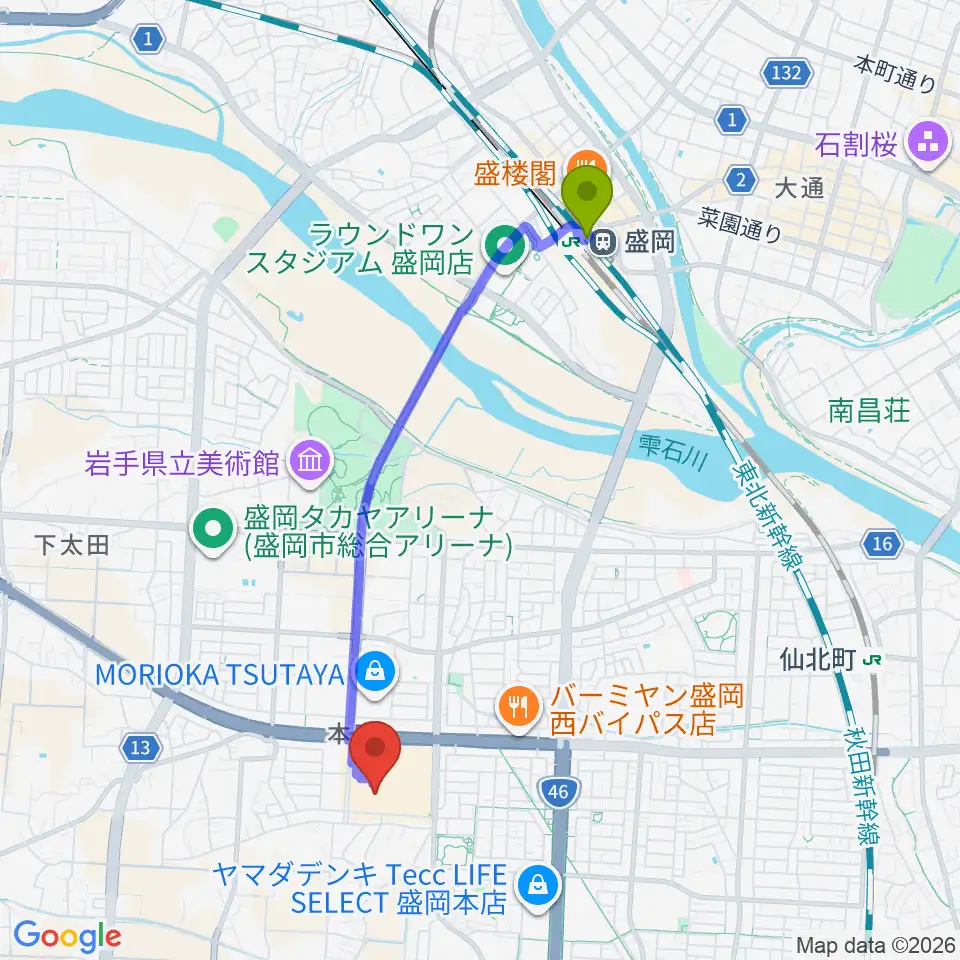 盛岡駅からJEUGIAカルチャーセンター イオンモール盛岡南へのルートマップ地図