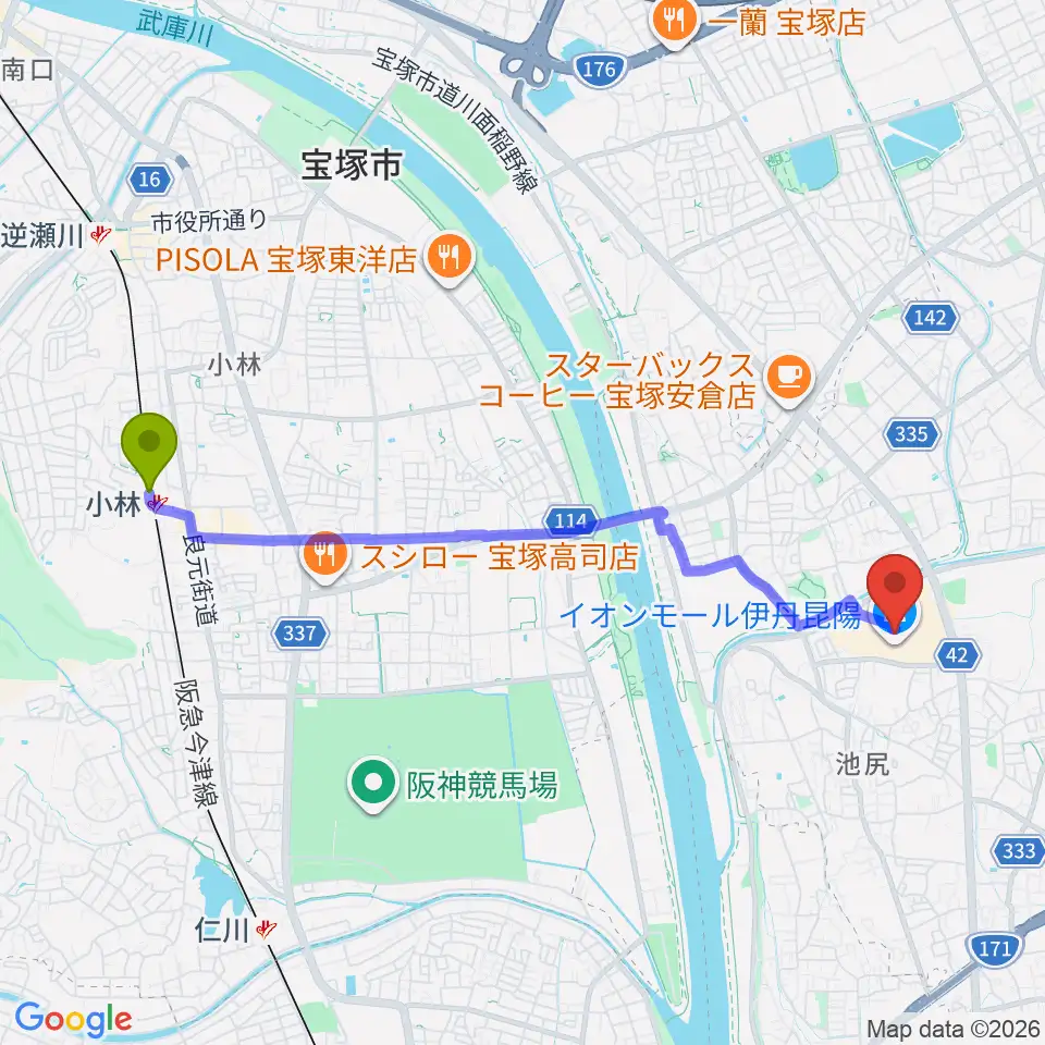 小林駅からJEUGIAカルチャーセンター イオンモール伊丹昆陽へのルートマップ地図