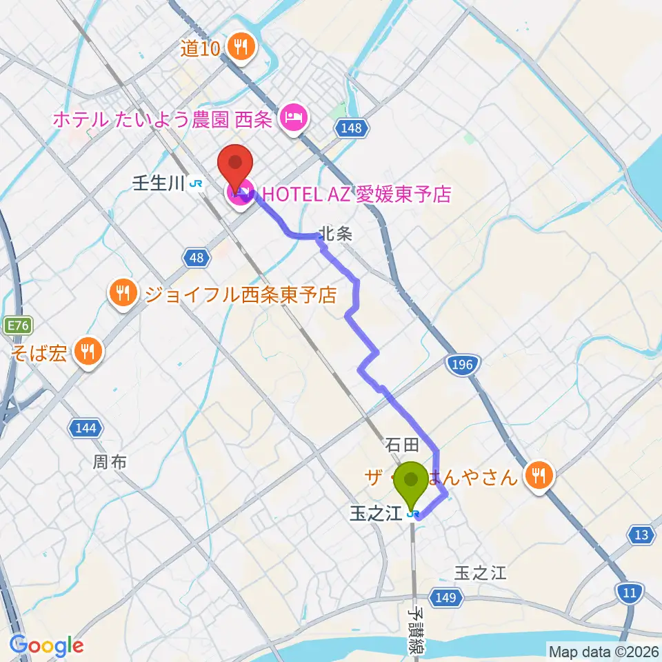 玉之江駅から電王堂へのルートマップ地図