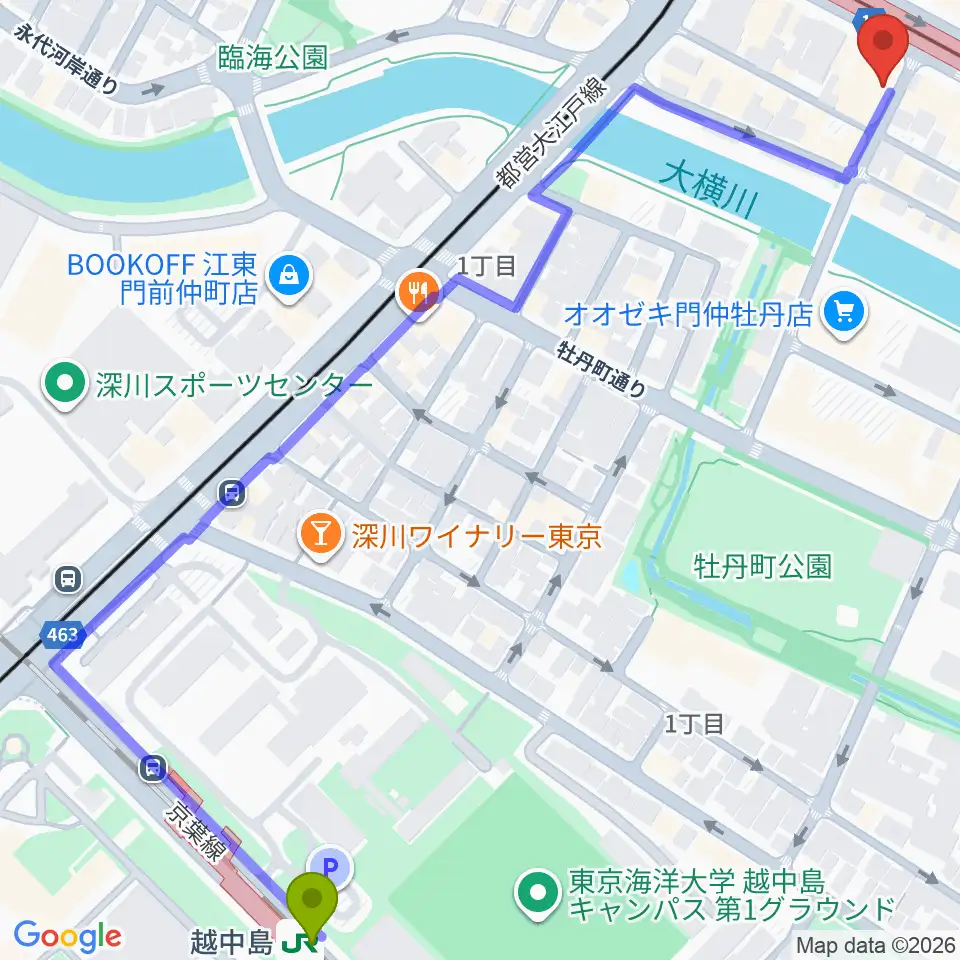 越中島駅から八重洲ピアノ社 門前仲町センターへのルートマップ地図