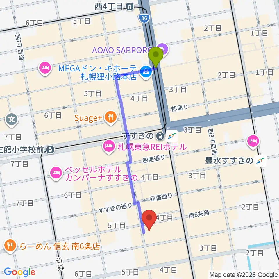 狸小路駅から札幌クレイジーモンキーへのルートマップ地図