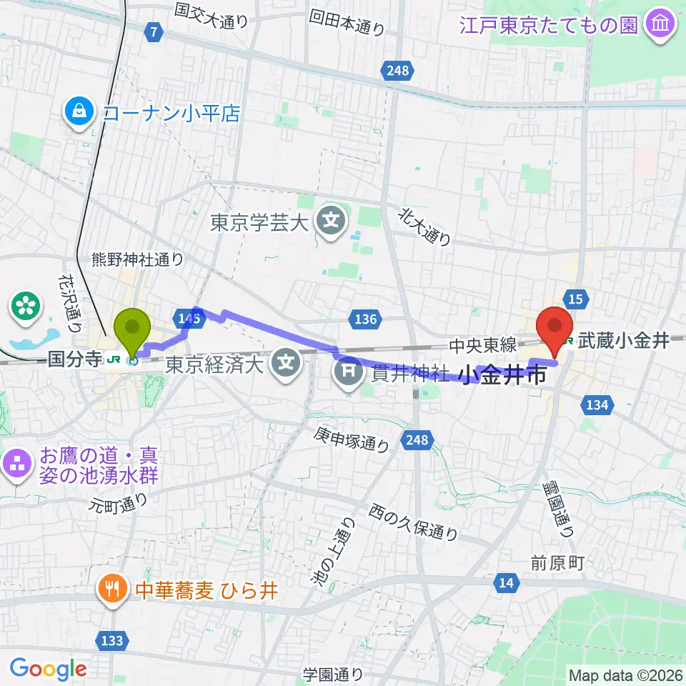 国分寺駅から小金井 宮地楽器ホールへのルートマップ地図