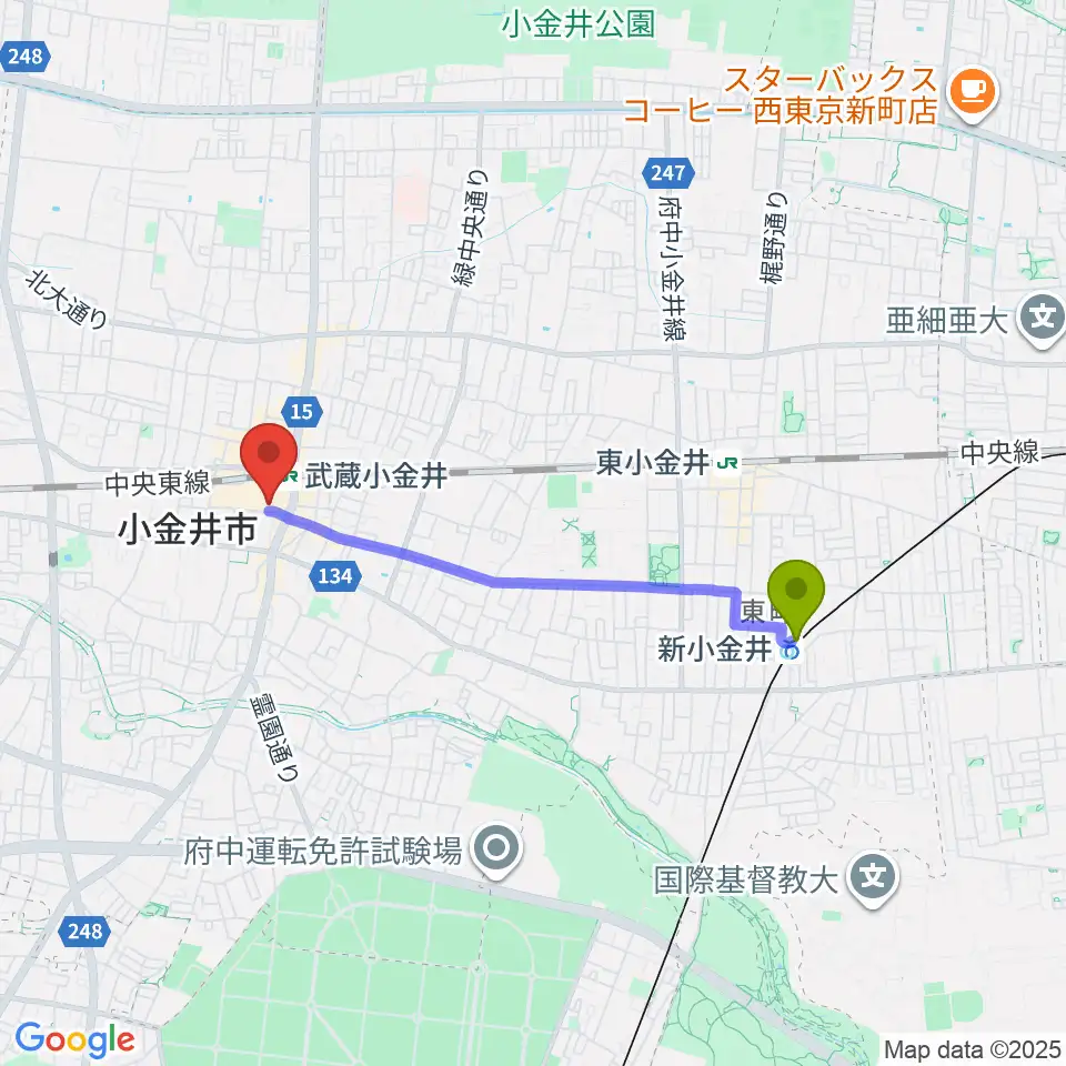新小金井駅から小金井 宮地楽器ホールへのルートマップ地図