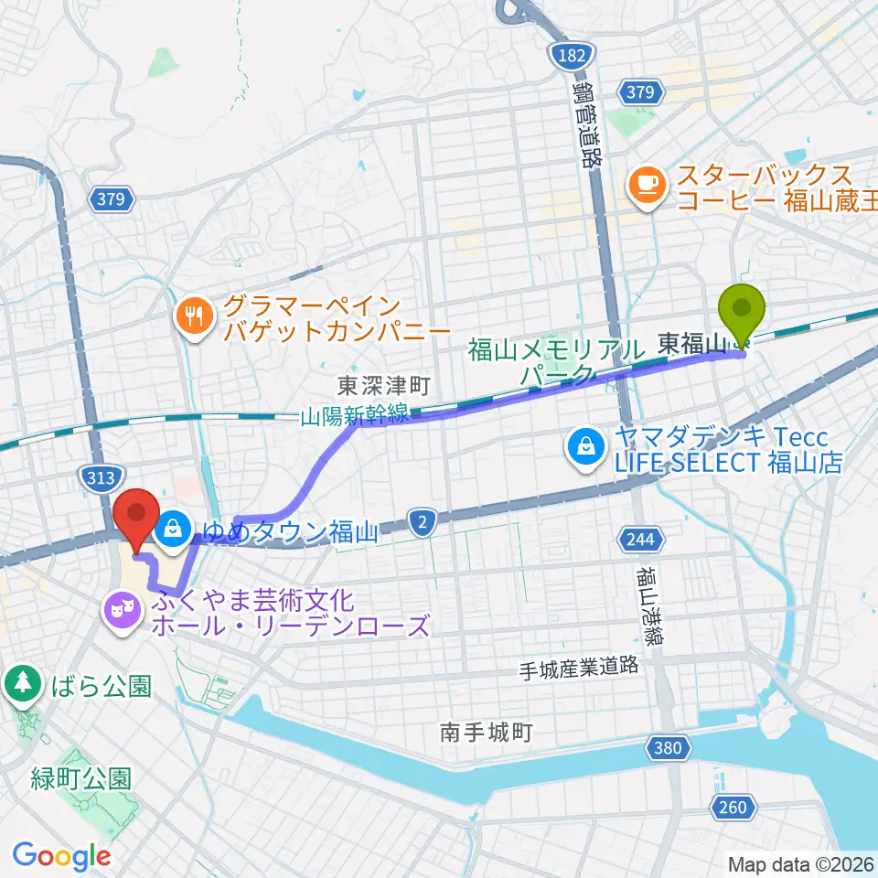 東福山駅からミュージックパークスガナミへのルートマップ地図