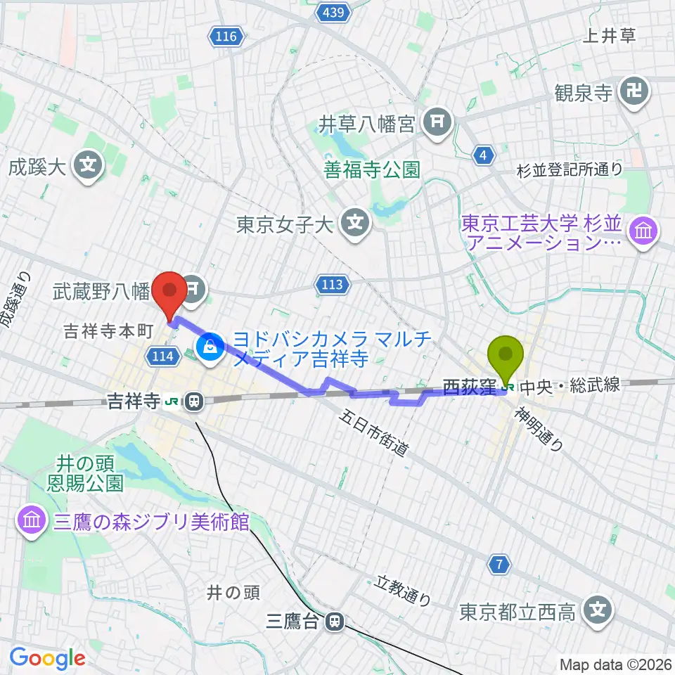 西荻窪駅からピアノスタジオノア 吉祥寺店へのルートマップ地図