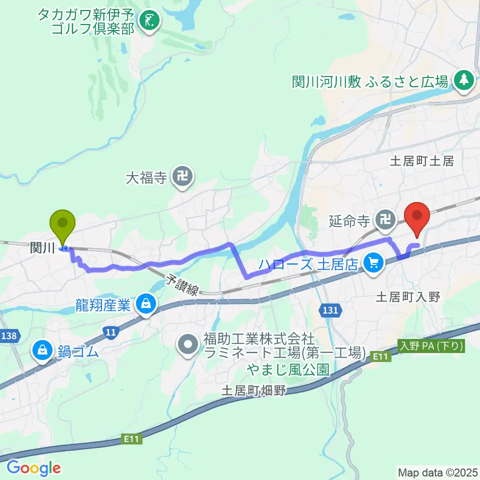 関川駅から土居文化会館ユーホールへのルートマップ地図