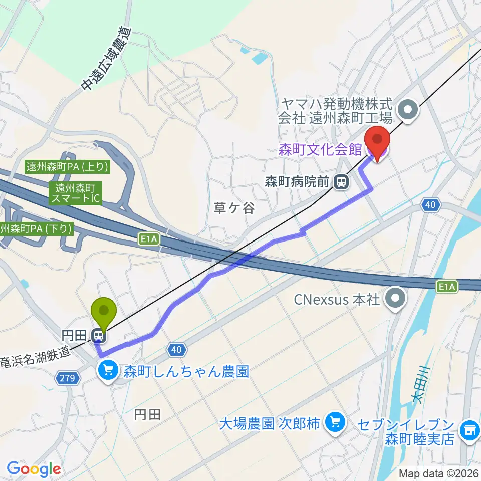 円田駅から森町文化会館ミキホールへのルートマップ地図