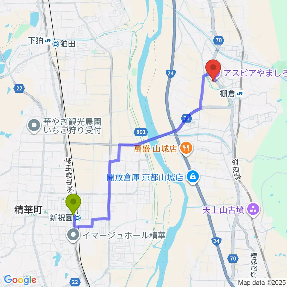 祝園駅から山城総合文化センター アスピアやましろへのルートマップ地図