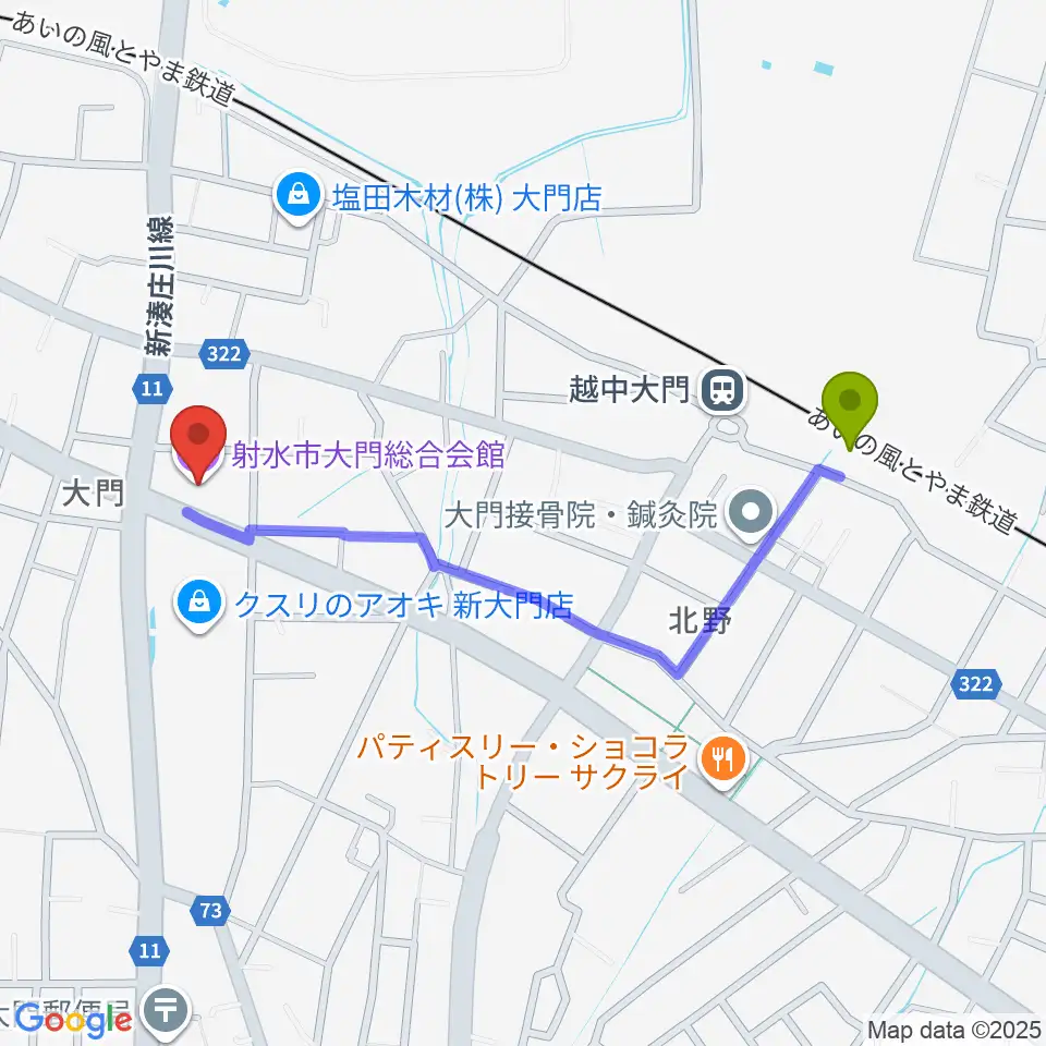 射水市大門総合会館の最寄駅越中大門駅からの徒歩ルート(約10分)地図