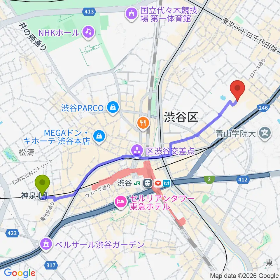 神泉駅から東京ウィメンズプラザへのルートマップ地図