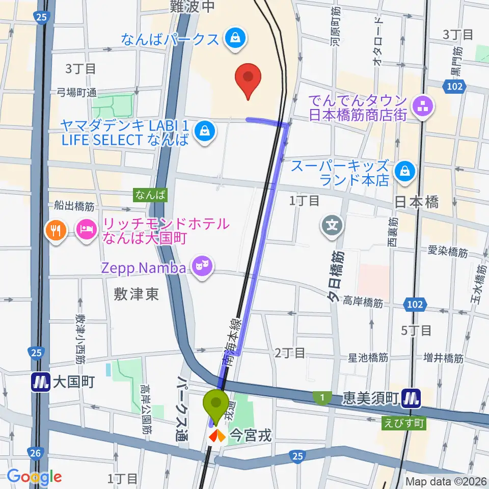 今宮戎駅からなんばパークスシネマへのルートマップ地図