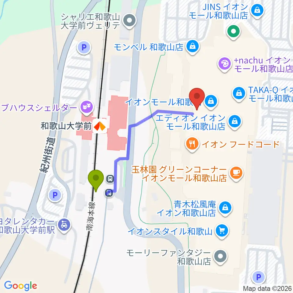 イオンシネマ和歌山の最寄駅和歌山大学前駅からの徒歩ルート(約4分)地図