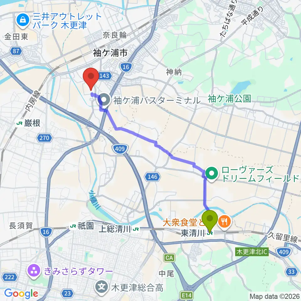 東清川駅からADEKA袖ケ浦球場へのルートマップ地図