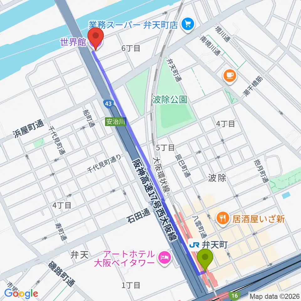 大阪弁天町 世界館の最寄駅弁天町駅からの徒歩ルート(約13分)地図