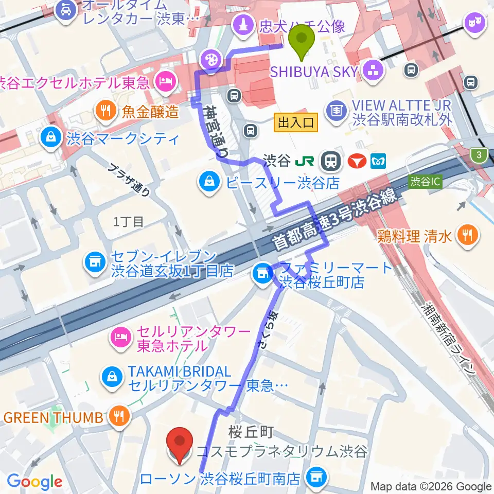 コスモプラネタリウム渋谷の最寄駅渋谷駅からの徒歩ルート(約7分)地図