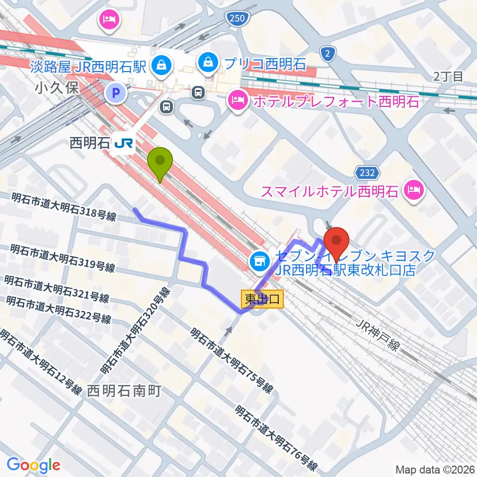 スガナミ楽器 西明石ミュージックセンターの最寄駅西明石駅からの徒歩ルート(約3分)地図