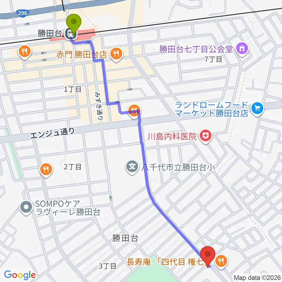 小山ギタースタジオの最寄駅勝田台駅からの徒歩ルート(約15分)地図