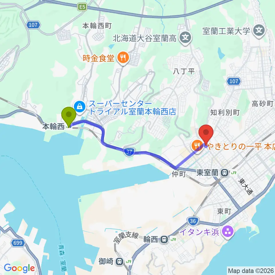 本輪西駅から室蘭Solisteへのルートマップ地図
