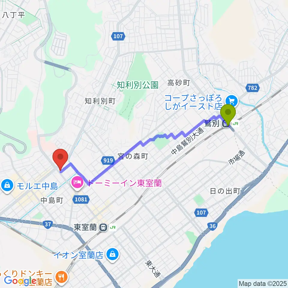 鷲別駅から室蘭Solisteへのルートマップ地図