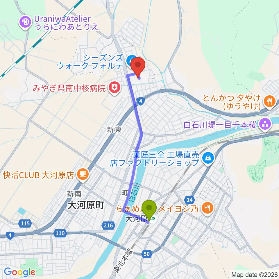 えずこホール仙南芸術文化センターの最寄駅大河原駅からの徒歩ルート(約31分)地図