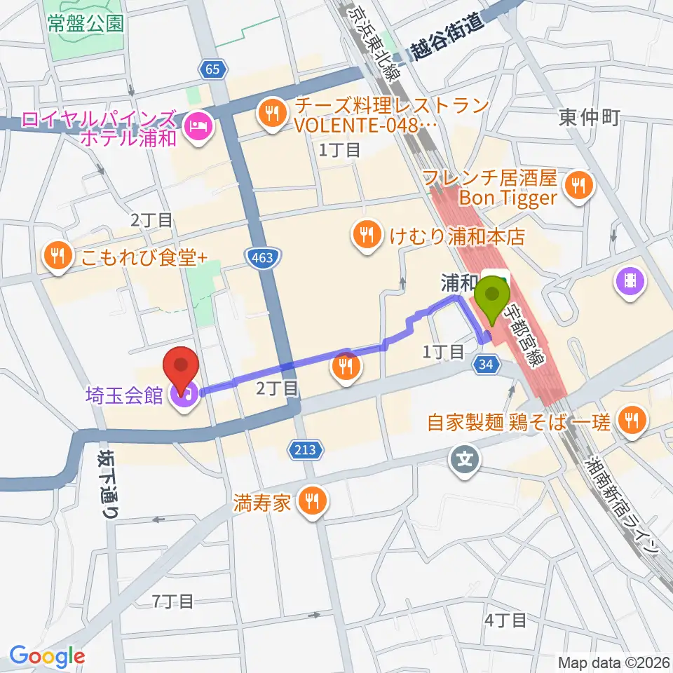 埼玉会館の最寄駅浦和駅からの徒歩ルート(約7分)地図