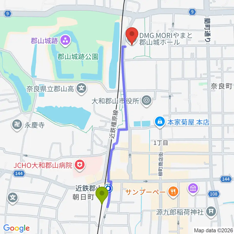 DMG MORI やまと郡山城ホールの最寄駅近鉄郡山駅からの徒歩ルート(約11分)地図