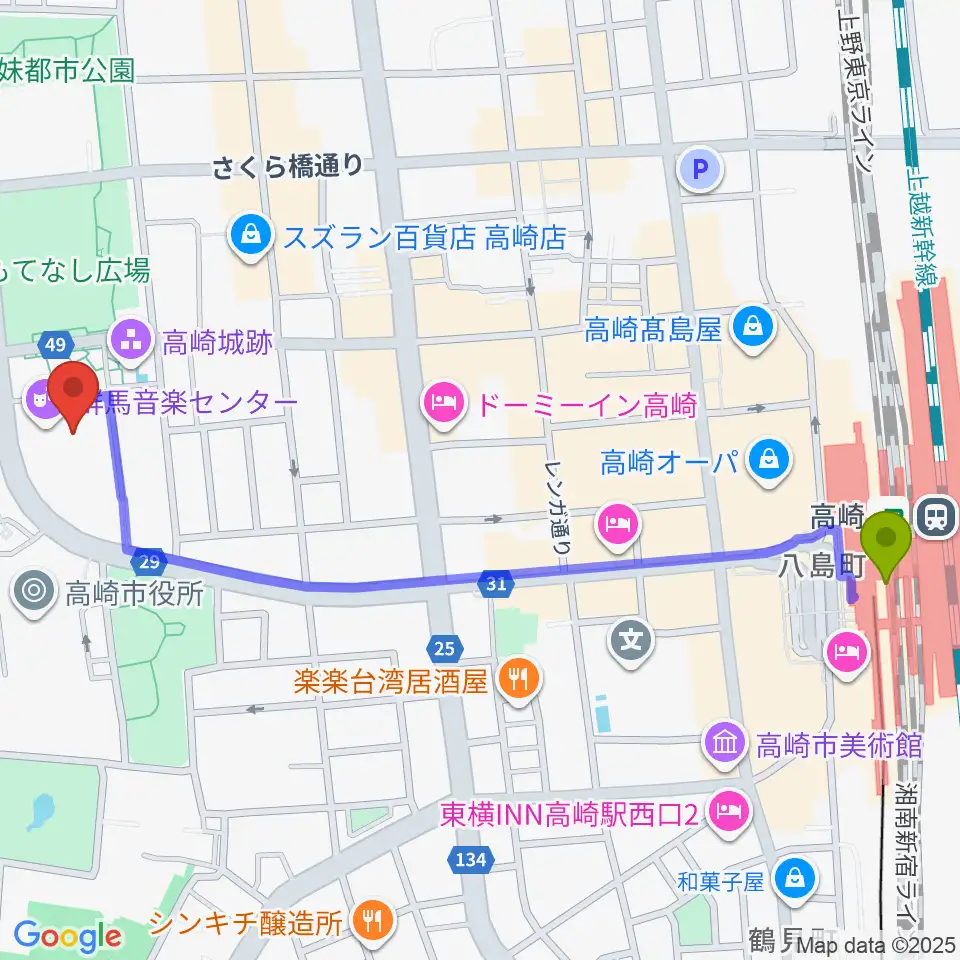 群馬音楽センターの最寄駅高崎駅からの徒歩ルート(約13分)地図